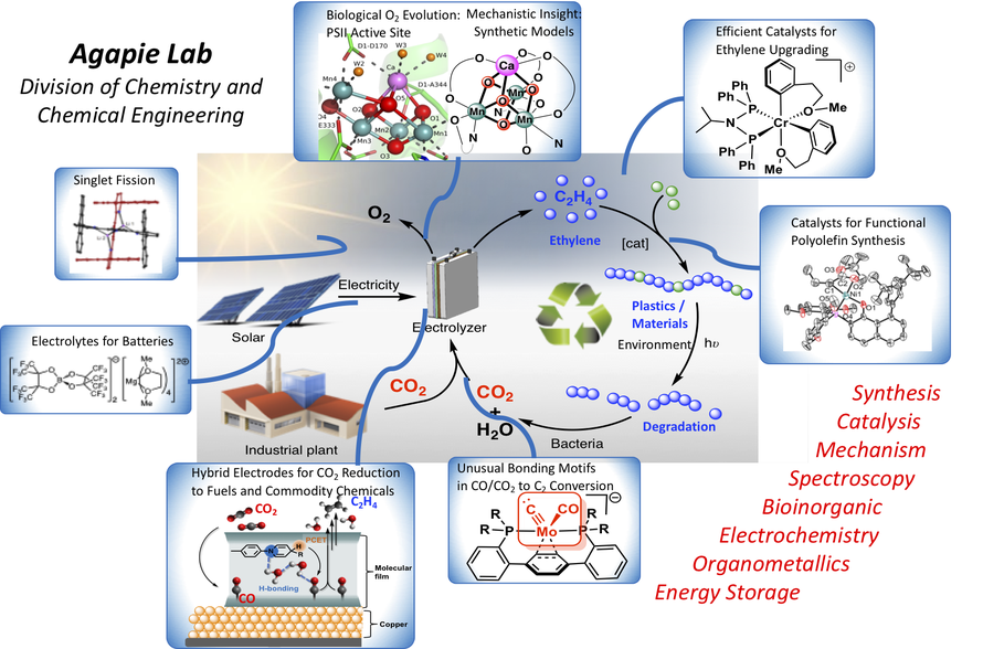 Research in the Agapie laboratory is targeted toward developing new materials and catalysts for sustainable technologies by using inspiration from biological systems. Some of the most fascinating catalysts in Nature display complex inorganic cofactors, sometimes in combination with organic cofactors, and perform chemical transformations (water reduction and oxidation, carbon dioxide reduction, dinitrogen reduction, dioxygen reduction) that are arguably prerequisites for the advance of society in the current context of limiting energy resources and environmental concerns. The group's approach to these chemical transformations is centered on the synthesis and study of metal complexes and materials relevant to organometallic and electrochemical catalysis. Given the scale of the potential applications, we focus on studies of inexpensive first-row transition metals and organic coatings for electrodes. We have developed new methodologies for the synthesis of coordination compounds, organometallic complexes and hybrid electrodes and have performed mechanistic studies to understand the properties and reactivity of these materials. The graphic below highlights some of our results and approaches.